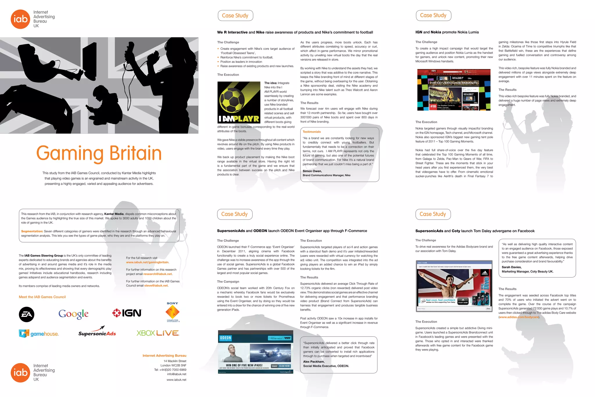 This document summarizes several case studies highlighting how companies have successfully integrated brands into video games. One case study describes how Nike was integrated into the game I AM PLAYR to promote Nike football boots through product placement and unlocking new boots in the game. Another case study outlines how SupersonicAds partnered with ODEON Cinemas and 20th Century Fox to promote the film Prometheus by rewarding Facebook gamers for booking tickets. A third case study details how Nokia promoted its Lumia smartphones through an IGN gaming feature about the top 100 gaming moments.