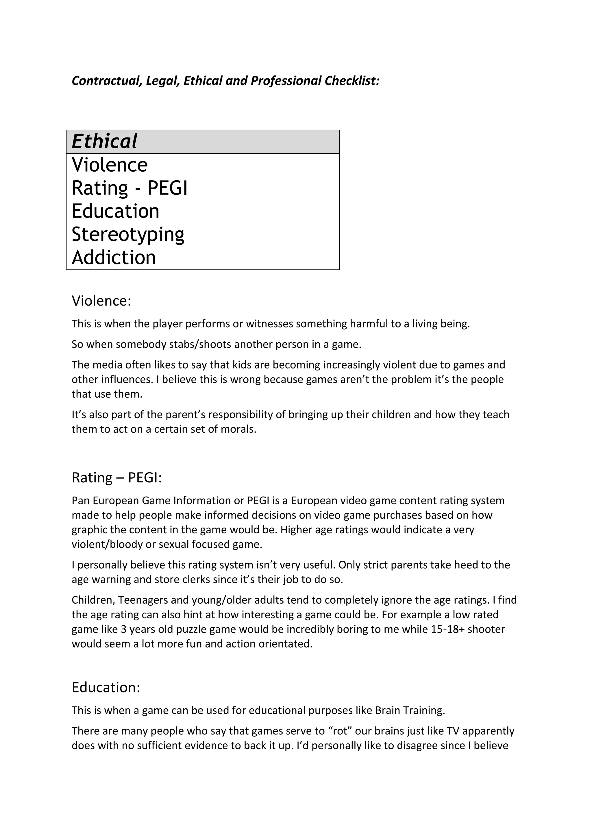 1) Violence in games and their rating systems aim to inform consumers but are often ignored, particularly by teenagers. While games don't cause violence, parents must teach morals.