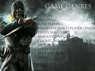 This document discusses the evolution of games from early genres to future virtual worlds. It summarizes key game genres including action, fighting, role-playing, and sports. The future of gaming may involve stimulating all five senses through sights, sounds, and potentially smells. Virtual worlds allow people to interact in simulated environments and buy virtual goods. Some gamers become highly engaged by joining guilds, earning money through game assets, or researching games. Sandbox games offer open-ended, goal-less exploration. While games provide enjoyment and learning, excessive play can lead to addiction symptoms like depression and withdrawal from social activities.