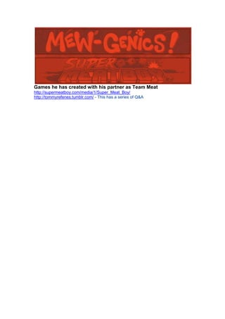 Tommy Refenes is an American video-game designer and programmer best known for creating the popular game Super Meat Boy. He began programming at a young age and is self-taught, dropping out of college to pursue a career in gaming. Throughout his career, Refenes has worked at several gaming companies and founded his own studio, Team Meat, where he co-created Super Meat Boy with Edmund McMillen.