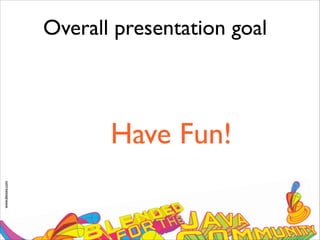 This document summarizes a presentation by Richard and Jasper from Sun Microsystems on gaming with JavaFX. The speakers are core engineers on JavaFX who will demonstrate physics demos using APIs like Box2D. They will show how to integrate physics into JavaFX scenes using a PhysicalScene and PhysicalObjects with physics bodies. The demos will apply concepts like gravity and initial velocity. JavaFX's new graphics stack called Prism is introduced as well, which replaces AWT and allows straight hardware access for performance. The presentation aims to show that JavaFX 1.2.1 is ready for games and encourages developing apps for the Java Store.