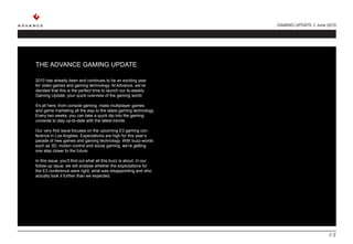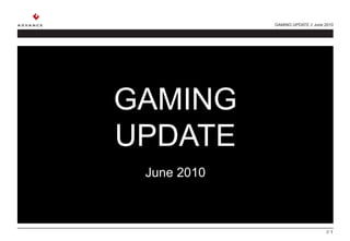 This document provides a summary of gaming news and updates for June 2010. It discusses upcoming events like the E3 gaming conference and new releases of massively multiplayer online (MMO) games. New motion control technologies for the PlayStation Move and Project Natal are highlighted. The document also mentions 3D gaming capabilities coming to the PlayStation 3 and advances in mobile gaming.