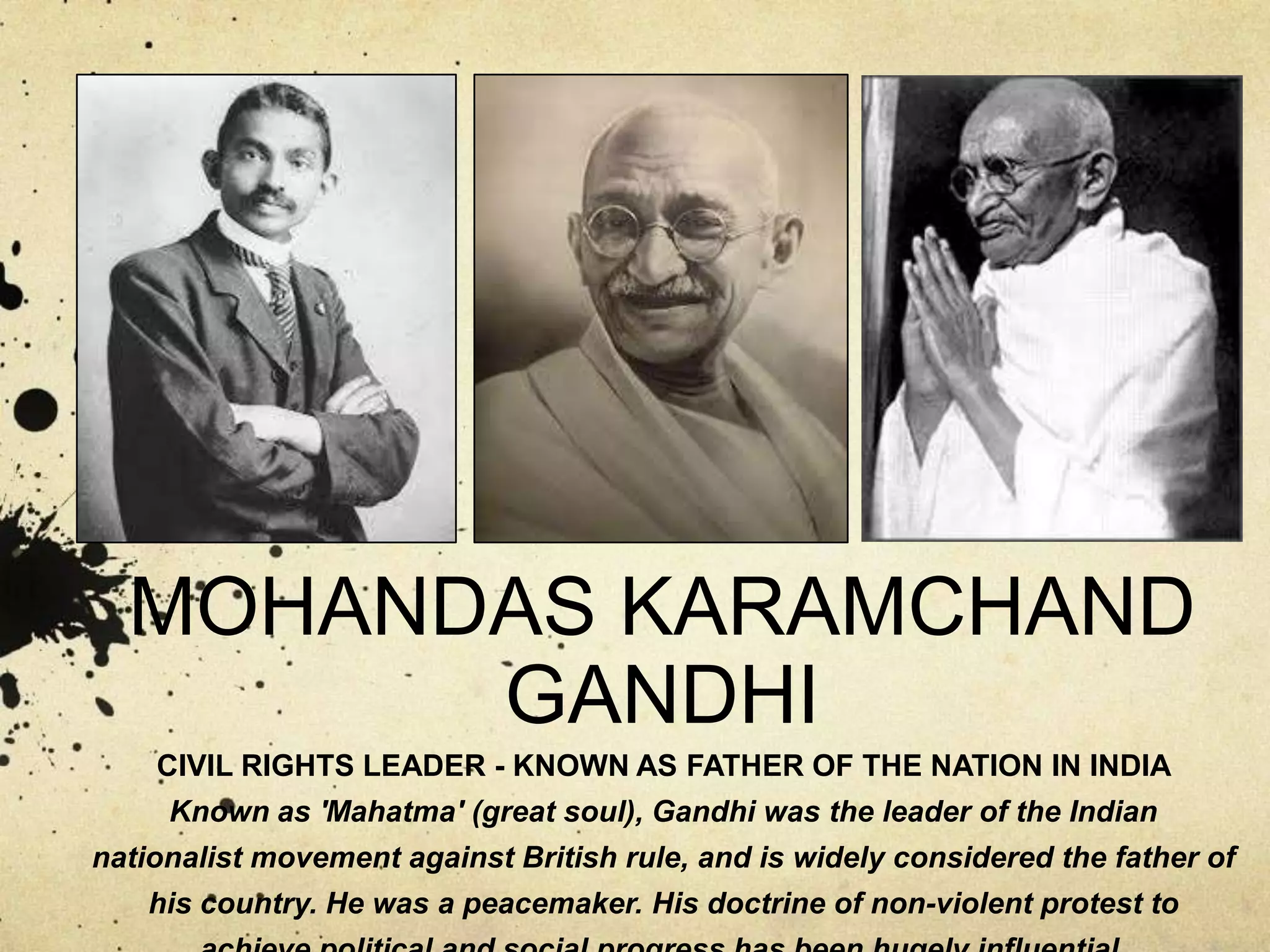 Mohandas Karamchand Gandhi, known as the 'Mahatma' or 'father of the nation' in India, led the Indian nationalist movement against British rule through non-violent protest. Born on October 2, 1869, in Gujarat, India, he experienced discrimination in South Africa, which fueled his commitment to fighting injustices through his philosophy of satyagraha. After returning to India, he became a prominent figure in the struggle for independence, was assassinated in 1948, and left a lasting legacy of non-violence and simple living.