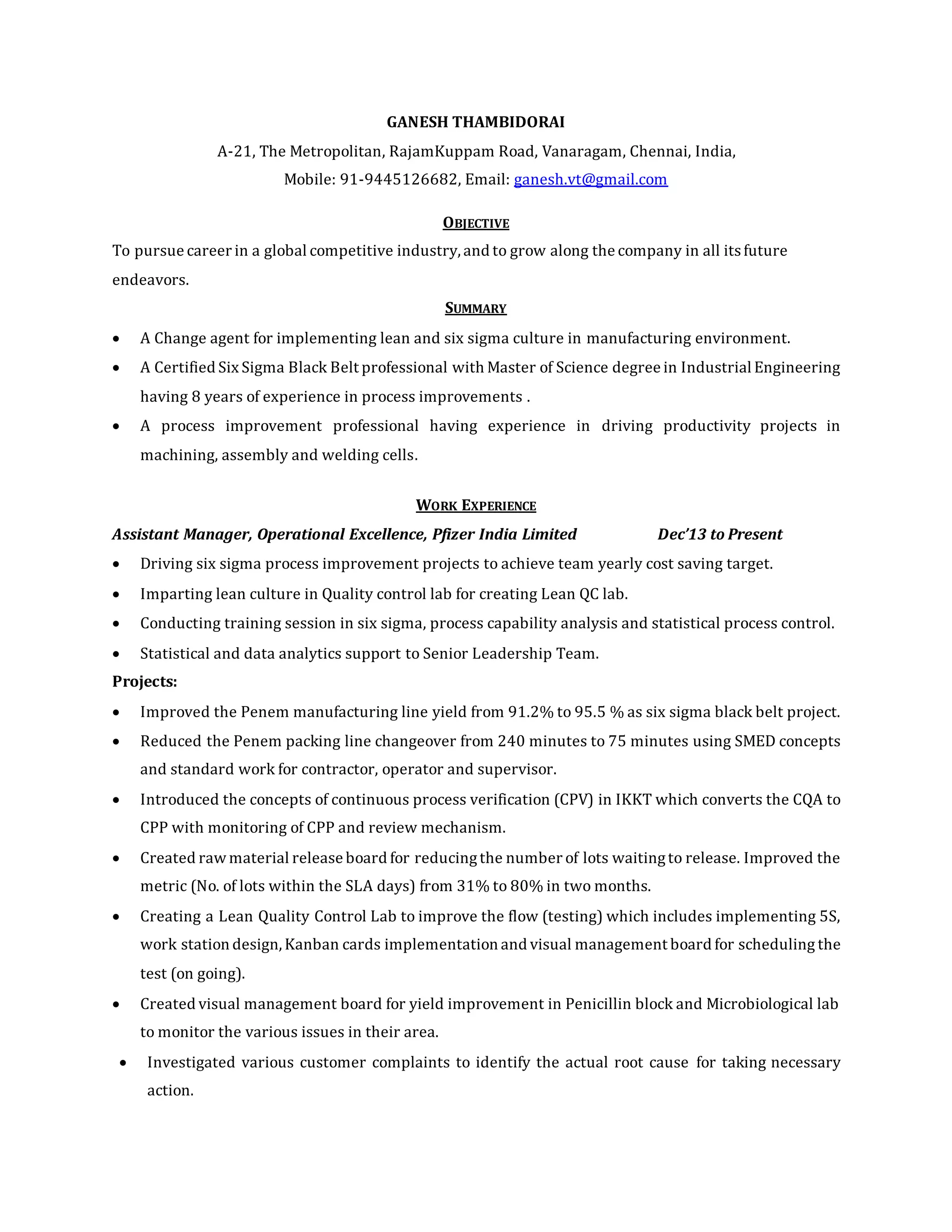 Ganesh Thambidorai is a certified Six Sigma Black Belt professional with over 8 years of experience in process improvement. He has a proven track record of driving projects that reduce costs and improve yields, such as increasing a manufacturing line's yield from 91.2% to 95.5%. Currently an Assistant Manager of Operational Excellence at Pfizer India Limited, his skills include Lean, Six Sigma, statistical process control, and change management. He holds an M.S. in Industrial Engineering and is seeking new career opportunities to continue growth.
