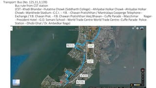 The Ganesh Murti Nagar Slums are located near Cuffe Parade in Mumbai and house around 80,000 residents in a small area. The slum homes are brightly painted small structures that provide minimal space for cooking and washing. Residents work as fishermen or commute to nearby areas for occupations like shops and scrap collection. There are nine temples, three mosques, and limited public toilet facilities for the large population. Access to water is restricted to a few hours per day through a political rationing system.