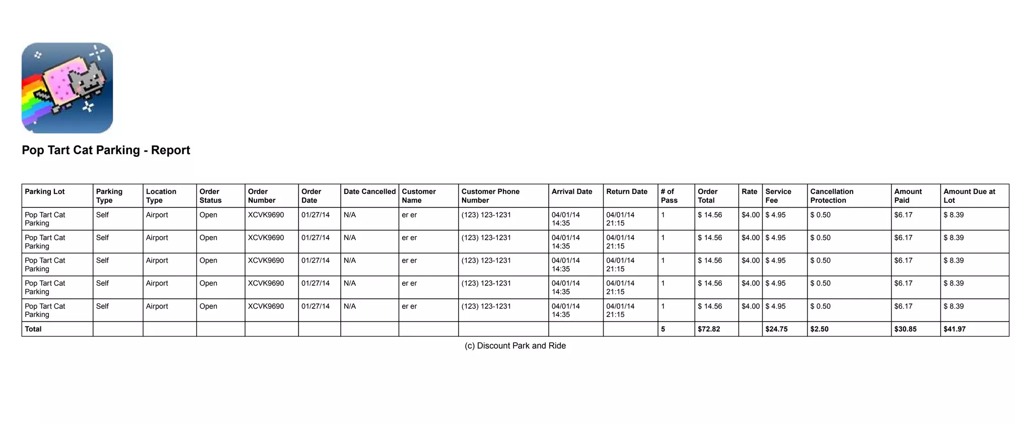 The document is a report from Pop Tart Cat Parking containing information about parking orders at the airport location. It lists 5 orders on the same date for a customer named er er with the phone number (123) 123-1231. Each order was for a single parking pass with a total of $14.56 and included additional fees like a $4 service fee. The total for all 5 orders came to $72.82 with extra fees bringing the total amount due to $41.97.
