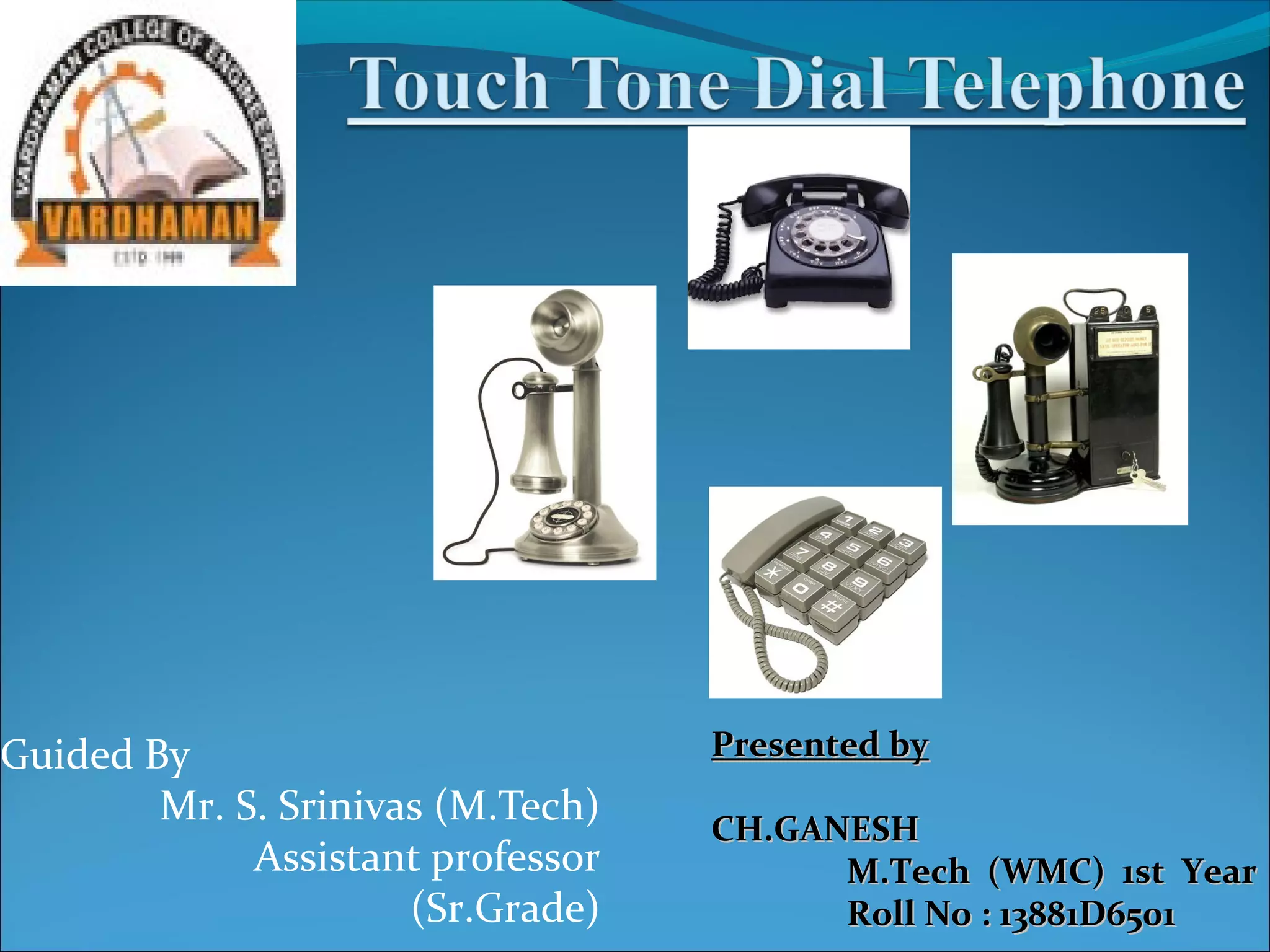 This presentation provides an overview of touch tone dial telephones and their components. It discusses the basic components of a telephone set including the transmitter, receiver, and electrical network. It then explains the essential components of a touch tone dial telephone such as the ringer circuit, on/off hook circuit, and hybrid network. The presentation describes how dual-tone multi-frequency signaling works to generate tones from a telephone keypad that are interpreted by the telephone switching system to route calls. It concludes with advantages and applications of telephone systems.