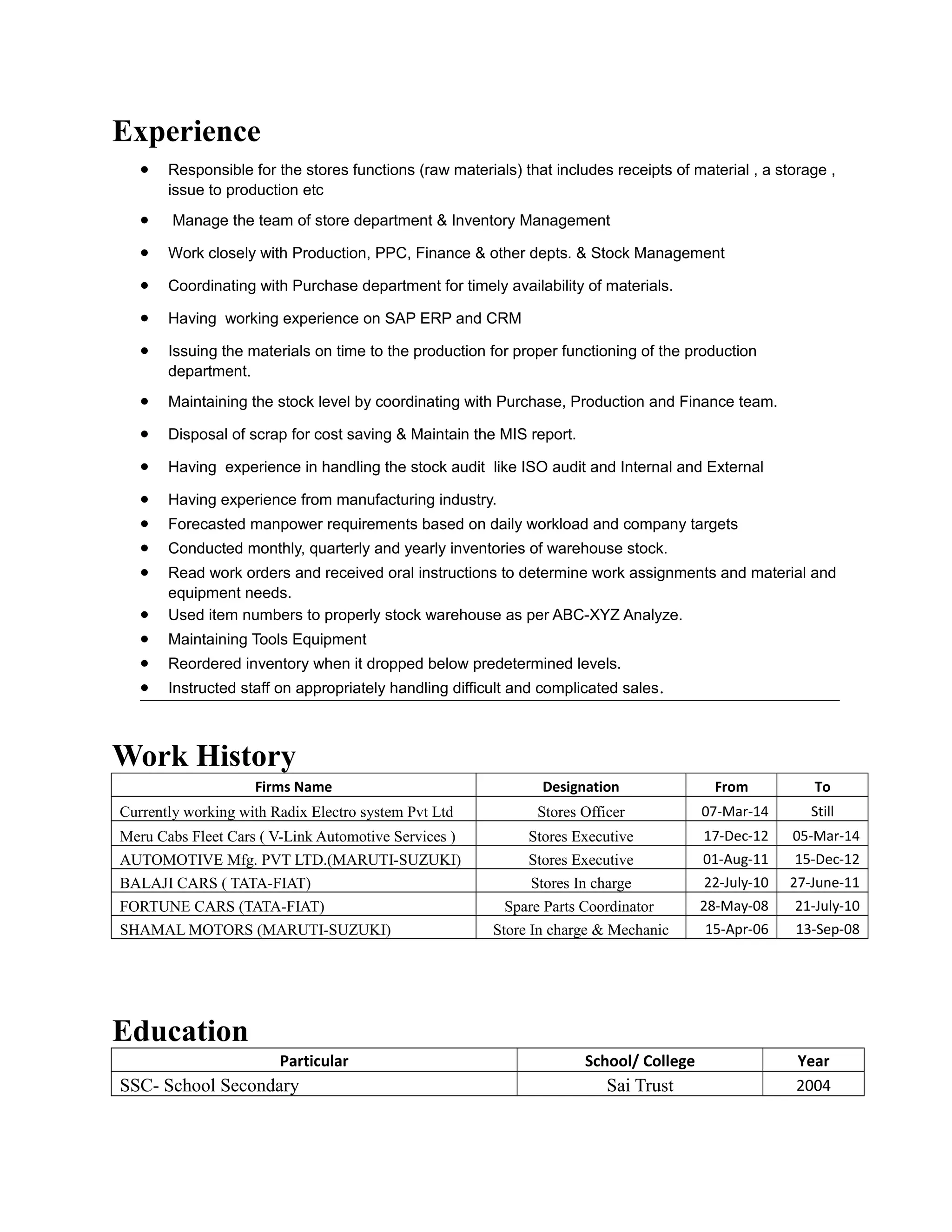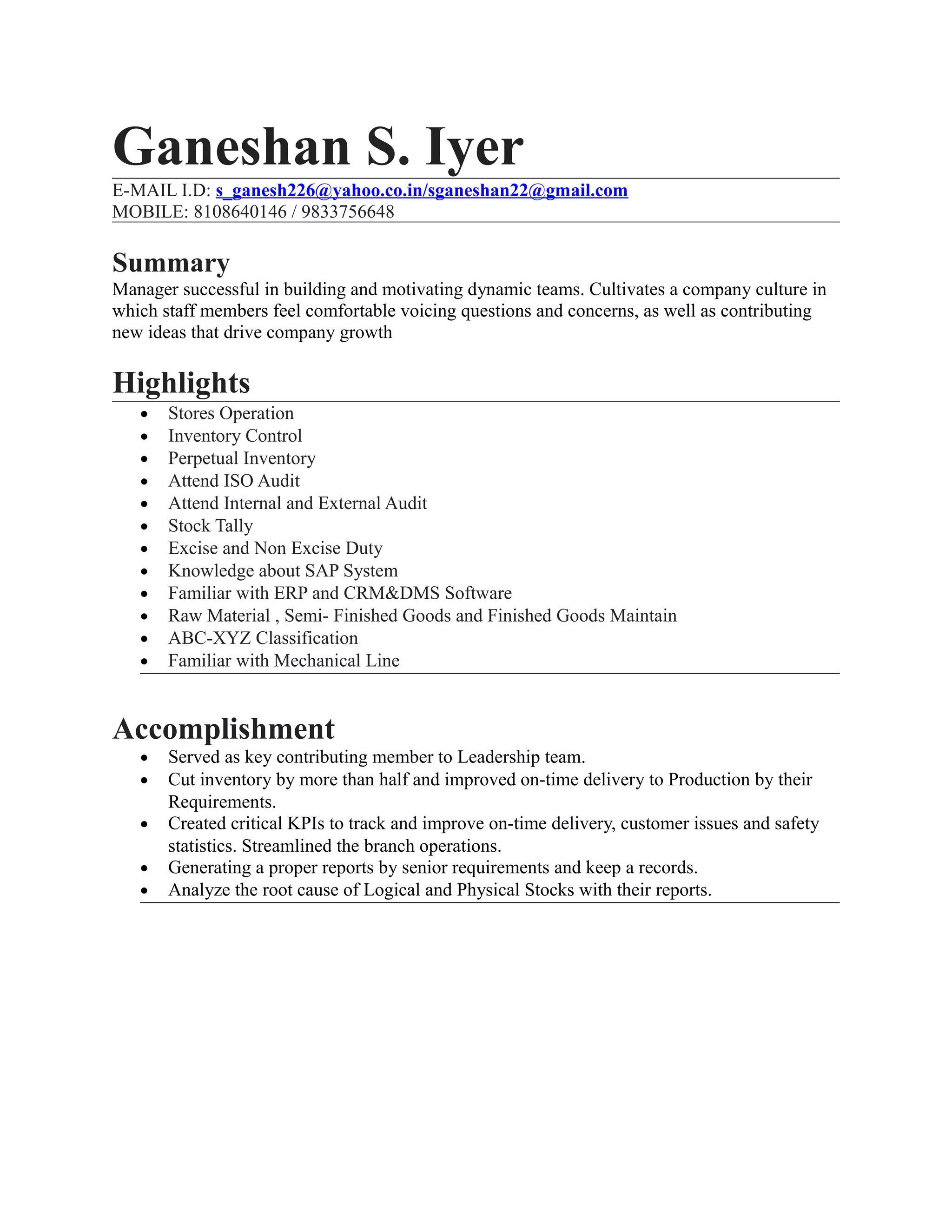 This document provides a summary and work history for S. Ganeshan, who has over 10 years of experience in inventory management and stores operations roles for automotive manufacturing companies. His experience includes inventory control, auditing, ABC classification, ERP systems, and maintaining relationships with suppliers and other departments. Currently he works as a Stores Officer for Radix Electro system Pvt Ltd, where he is responsible for stores functions like receiving materials and storage, and issues materials to production on time.