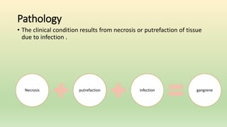 Gangrene results from necrosis or putrefaction of tissue due to infection. It can be caused by arterial obstruction from conditions like thrombosis, embolism, diabetes, or physical agents like burns, frostbite, or chemicals. There are three main types of gangrene: wet gangrene caused by severe bacterial infection on top of necrosis and found in internal organs or exposed parts; dry gangrene caused by gradual blood supply obstruction and found on exposed parts; and gas gangrene which has gas formation in addition to wet gangrene and is found on exposed parts. Treatment involves addressing predisposing factors and amputation of the gangrenous part to prevent spreading.
