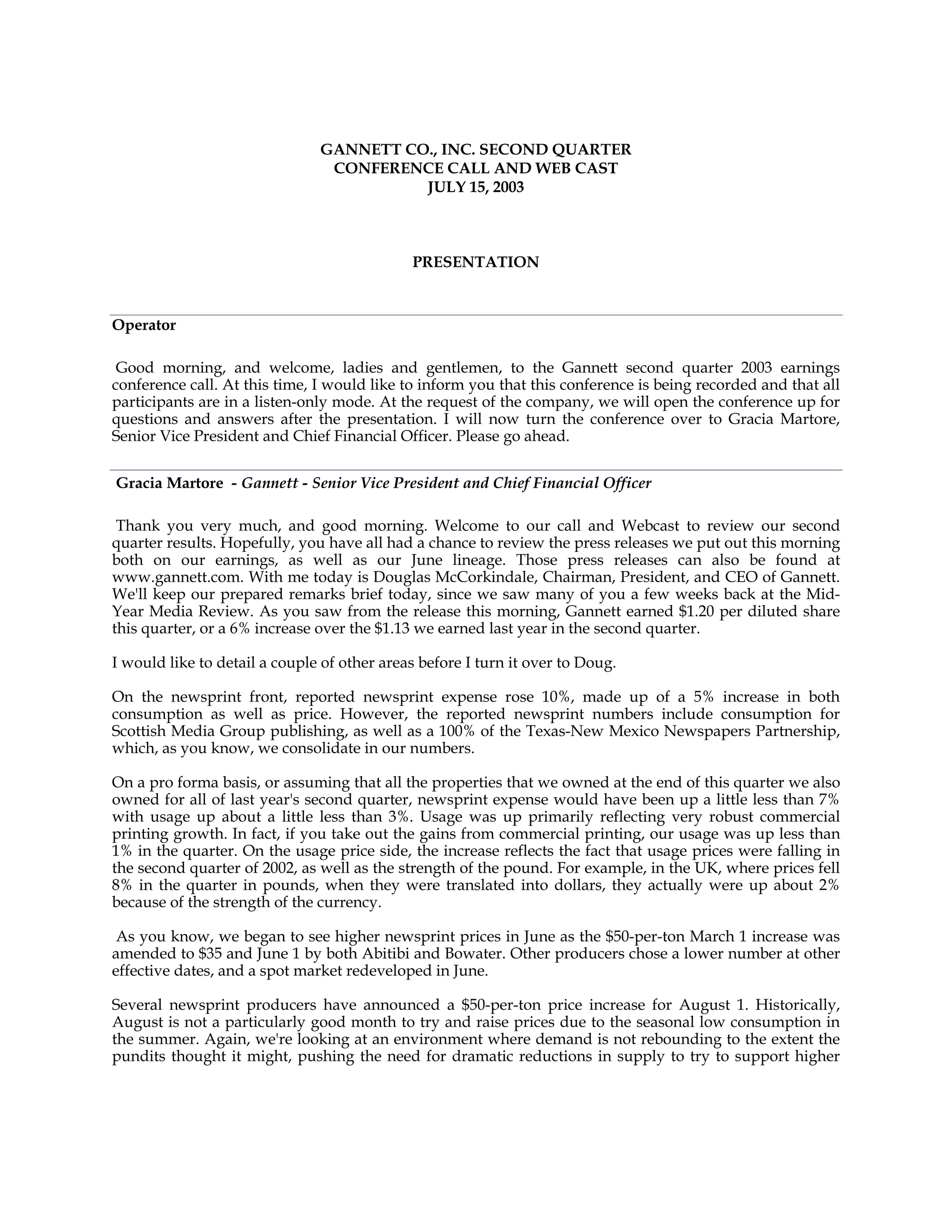Gannett reported second quarter earnings of $1.20 per share, a 6% increase over the prior year. Newspaper advertising revenues rose 3% domestically and Newsquest revenues were up 3% in pounds in the UK. Television revenues increased 1% despite lower political spending. Cash costs rose over 6% including acquisitions, but on a pro forma basis excluding acquisitions costs rose around 3% reflecting commercial printing growth and currency impacts. July advertising trends were mixed with television pacings slightly below prior year when adjusting for large political spending last year. Near-term outlook remained cautious due to economic uncertainty.