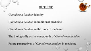 This document discusses Ganoderma lucidum, commonly known as Reishi mushroom. It provides details on its traditional use in Chinese and Japanese medicine to treat diseases and promote longevity. The document outlines the biologically active compounds in G. lucidum such as polysaccharides, terpenoids, and proteins. Modern research has confirmed G. lucidum's immunomodulatory, anticancer, and other medicinal properties. Future research goals include clarifying taxonomy, identifying safe doses, optimizing cultivation conditions, and conducting clinical trials to provide evidence for G. lucidum-based medications.