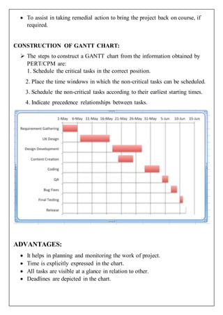 A Gantt chart is a bar chart that illustrates a project schedule and the phases and activities of a project work breakdown structure. It was introduced by Henry Gantt around 1910-1915. A Gantt chart shows the current schedule status, measures task duration in the project, and represents cost, time and scope. It is useful for planning, scheduling, and monitoring projects by laying out task order and allowing visualization of progress. The steps to construct a Gantt chart include scheduling critical and non-critical tasks based on precedence relationships and earliest start times.