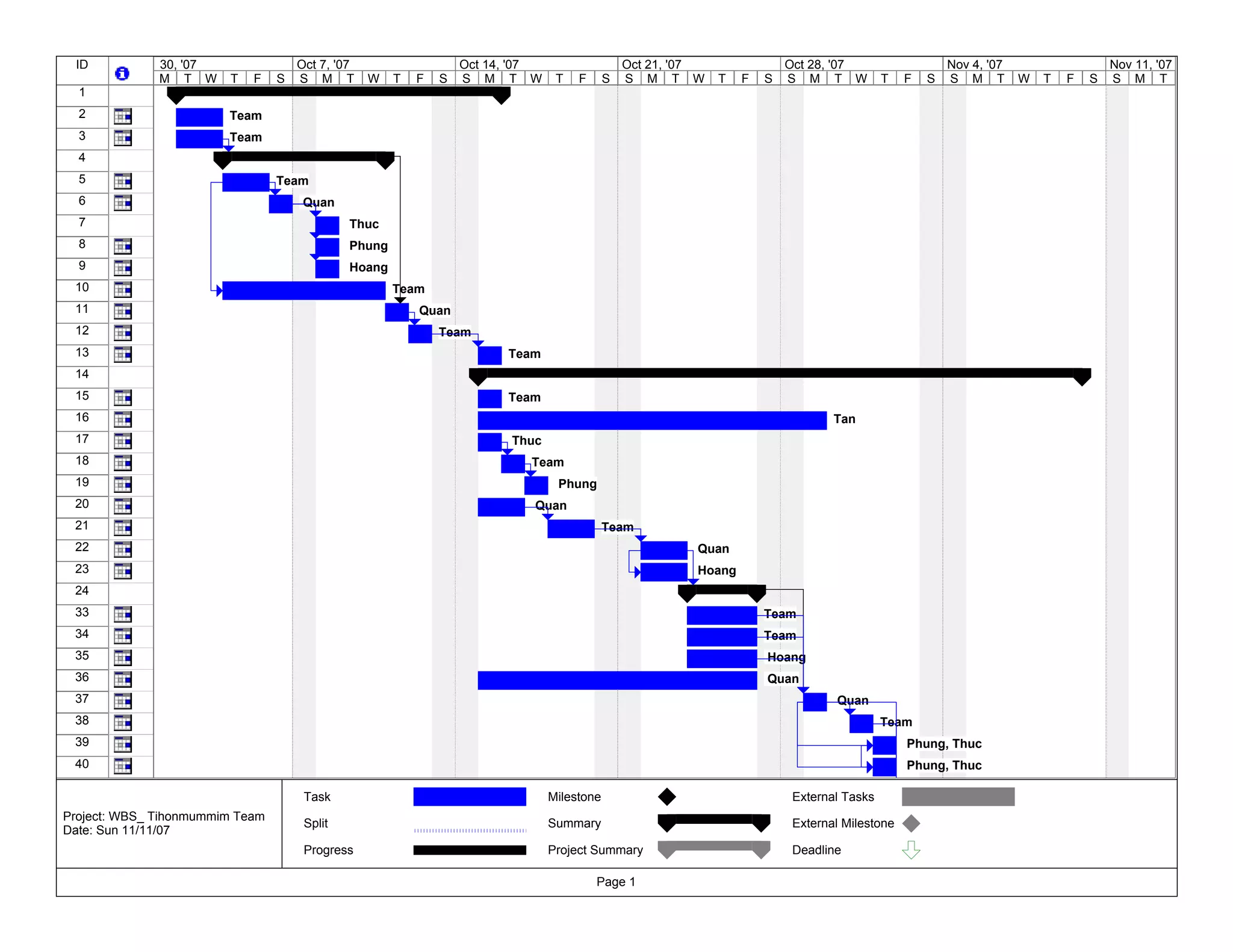 This document outlines the progress of tasks for a project over multiple weeks. It assigns tasks to team members Quan, Phung, Hoang, Thuc, and Tan on specific dates. It also tracks milestone and external tasks over the course of the project timeline.