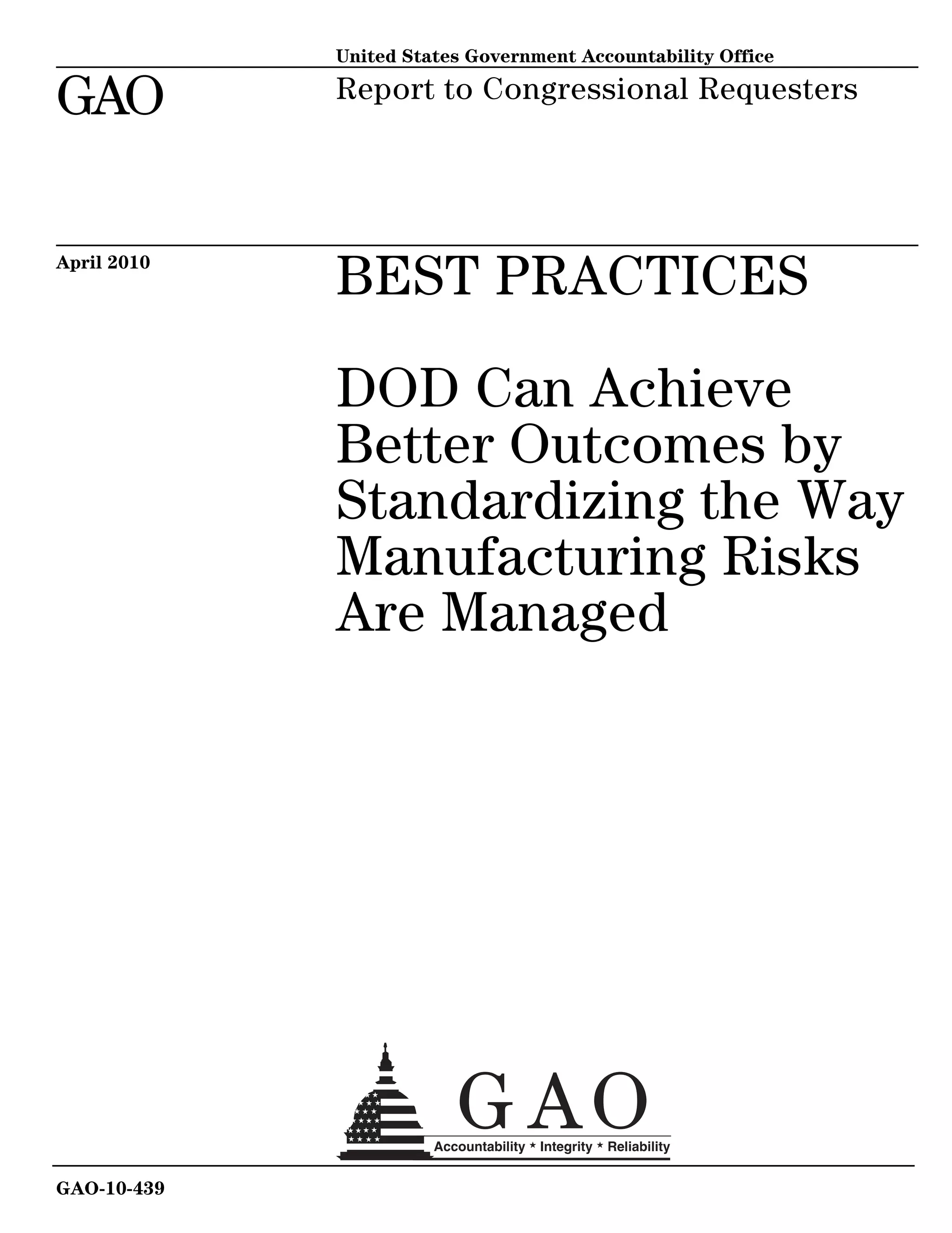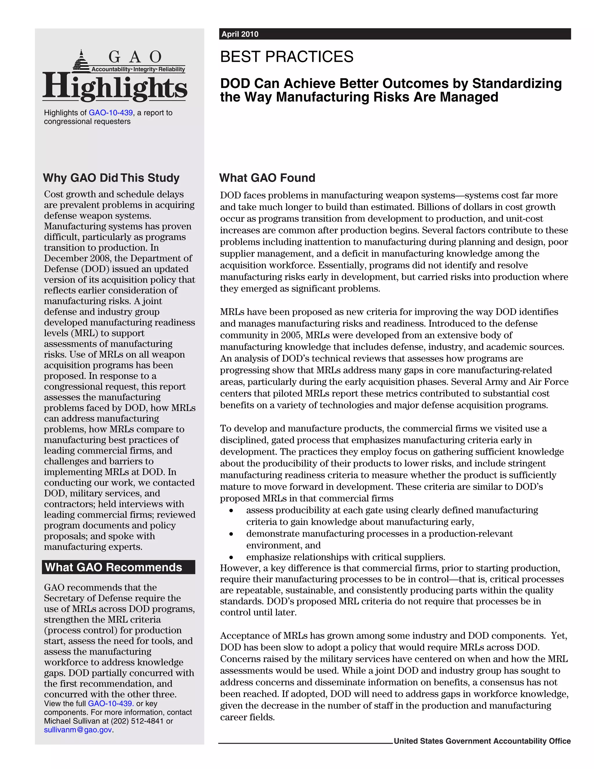 The United States Government Accountability Office (GAO) found that cost growth and schedule delays are prevalent problems in the Department of Defense's (DOD) acquisition of weapon systems. Manufacturing these complex systems has proven difficult, particularly during the transition from development to production. GAO identified several factors that contribute to these problems, including a lack of attention to manufacturing risks early in the design process. GAO recommends that DOD adopt a standardized approach called Manufacturing Readiness Levels (MRLs) to systematically identify and address manufacturing risks throughout the acquisition process. MRLs embody best practices from leading commercial firms for assessing producibility and process control. However, DOD has been slow to adopt a policy requiring MRL