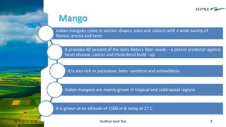 The document discusses the cultivation, production, and export of Indian mangoes, highlighting their nutritional benefits and the practices necessary for quality assurance through Good Agricultural Practices (GAP). It details various agricultural standards, certification processes, and specific cultivation techniques to enhance mango yield and quality, aiming to meet international export demands. Additionally, it covers post-harvest operations and the preparation of mango pulp for export, ensuring compliance with food safety standards.