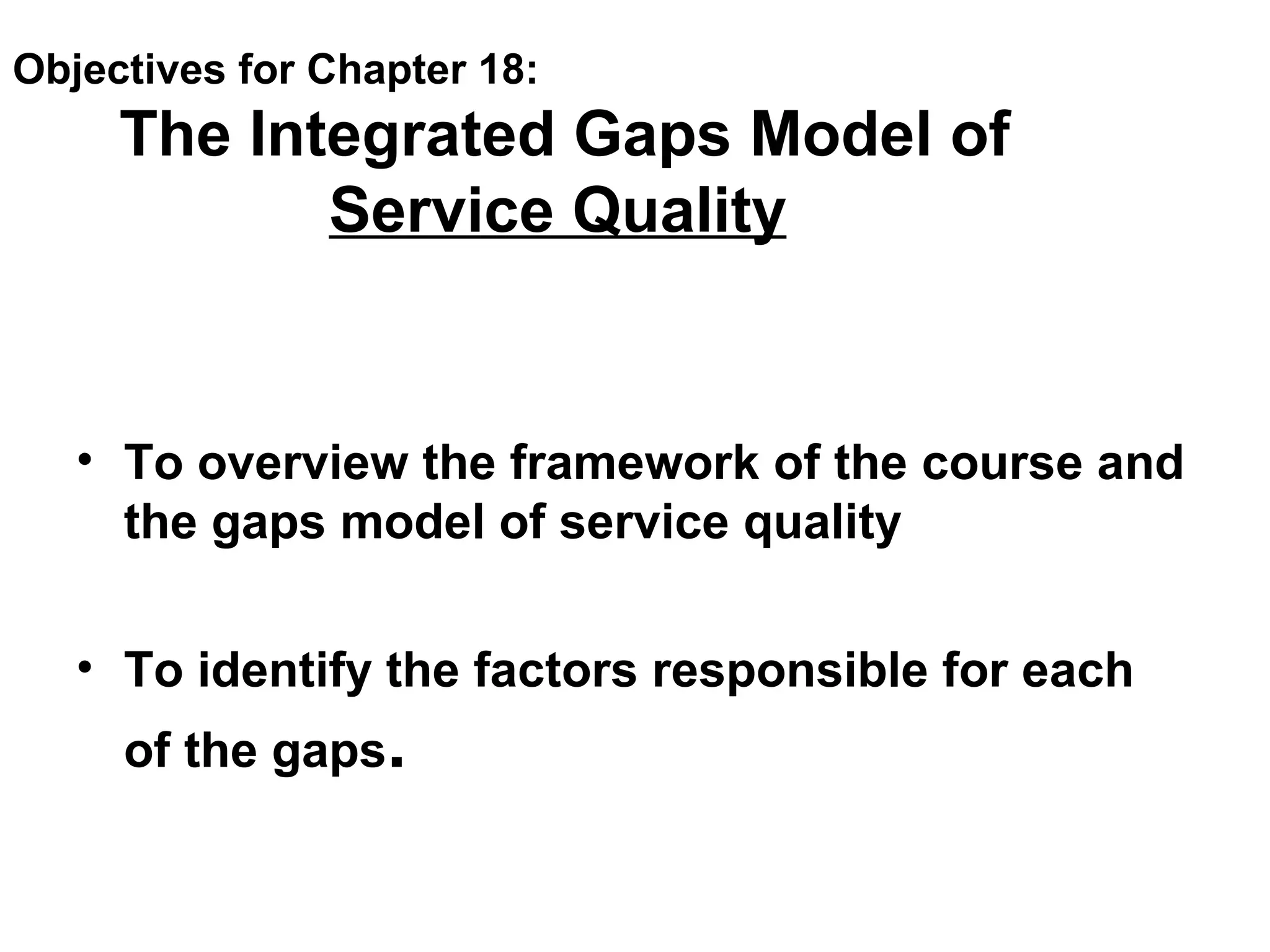 This document outlines the objectives and key concepts of Chapter 18, which discusses the gaps model of service quality. It introduces the five gaps in the model - the customer gap and gaps 1 through 4 within the company. It then identifies and explains the major factors that can lead to each of the four provider gaps. The gaps model and its application to understanding service quality issues are the main topics covered.