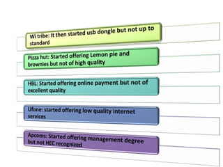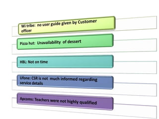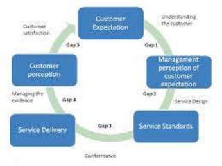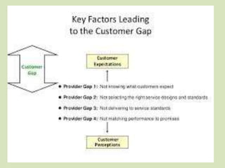 The document discusses the Service Quality Gaps Model, which identifies four key gaps between a customer's expectations of service and a provider's actual service performance. The four gaps are: 1) differences between customer expectations and management perceptions, 2) differences between management perceptions and service quality specifications, 3) differences between specifications and actual service delivery, and 4) differences between service delivery and external communications to customers. The document also provides examples of how companies like IKEA, Starbucks, IBM and GE work to close these gaps to improve customer satisfaction.