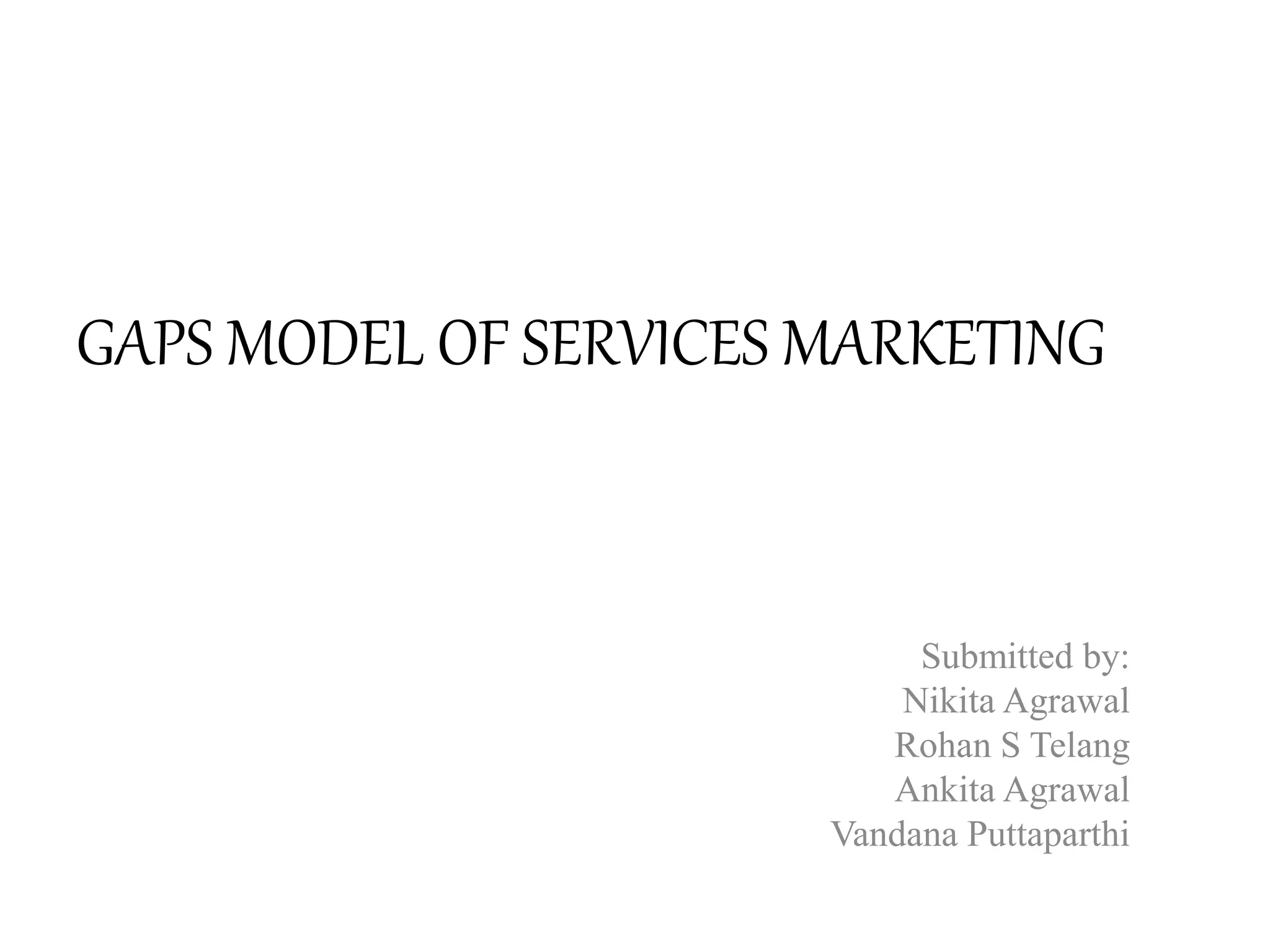The document discusses the GAPS model of services marketing. It outlines five potential gaps between a customer's expected service and the service actually delivered: (1) the gap between customer expectations and company perception of expectations, (2) the gap between customer expectations and service design/standards, (3) the gap between service design and service delivery, (4) the gap between service delivery and external communications, and (5) the gap between expected service and perceived service. Examples are provided for each gap.