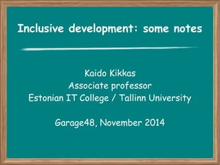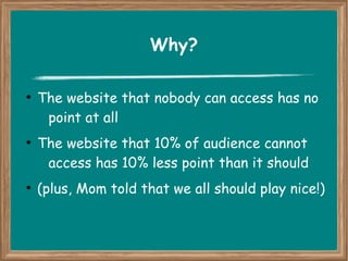 The document discusses inclusive development and accessibility in website design. It notes that websites should be accessible to all audiences, including those with disabilities, as inaccessible sites exclude users and limit their reach. It outlines different types of disabilities that may impact accessibility like visual, mobility, hearing and cognitive impairments. The document provides guidance on how to design accessible websites by following standards like W3C, using responsive design, and validating websites for accessibility issues. It recommends tools for validation and testing accessibility.