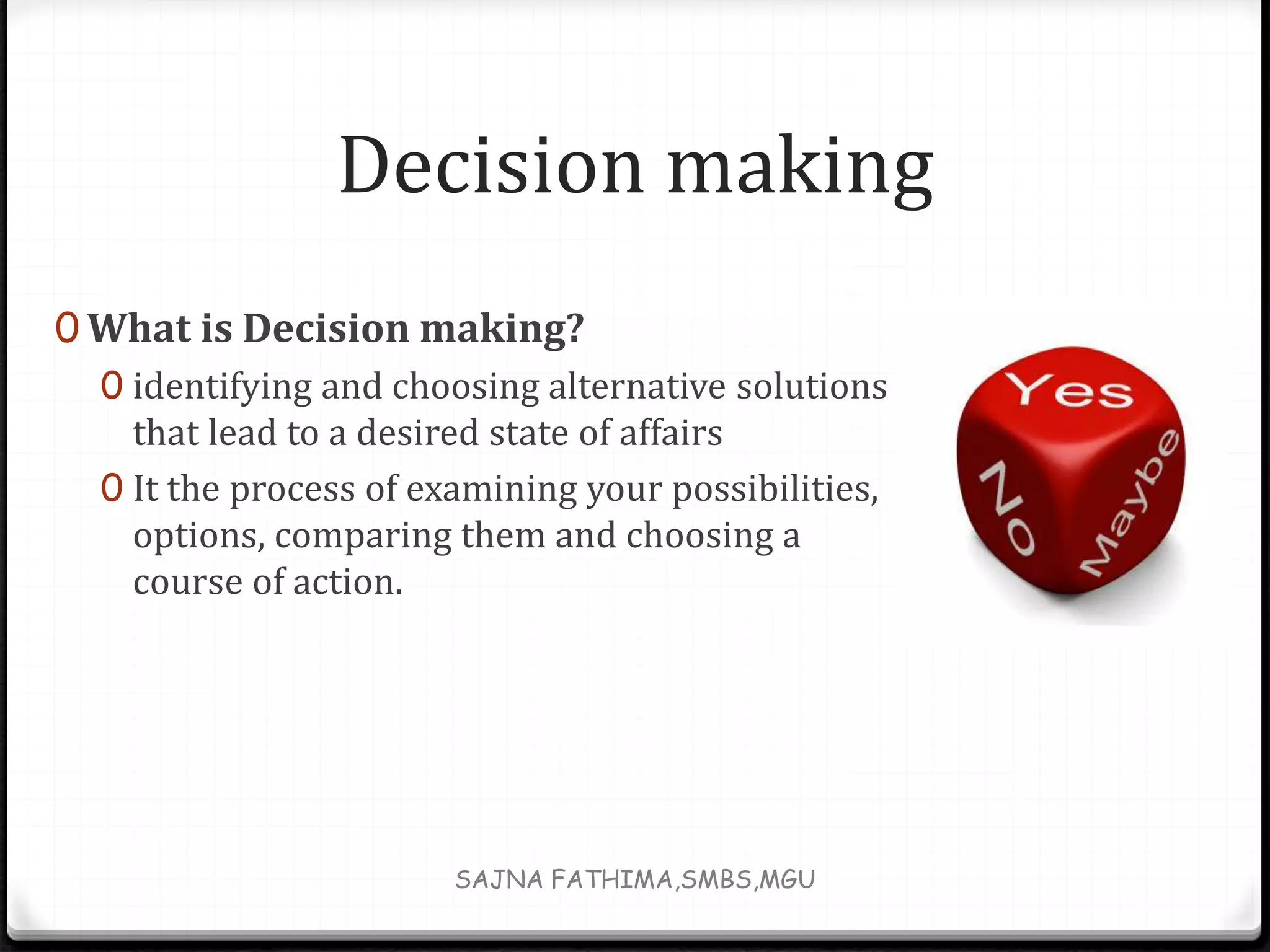 The document discusses decision making and the Garbage Can Model of organizational choice. It describes decision making as identifying options, comparing them, and choosing a course of action. The Garbage Can Model contends that decisions in organizations are random and unsystematic, with problems, solutions, participants, and choices interacting like items in a garbage can. Under this model, solutions may be proposed without existing problems, choices made without solving problems, and problems may persist without solutions. The model explains decision making in environments of high uncertainty.