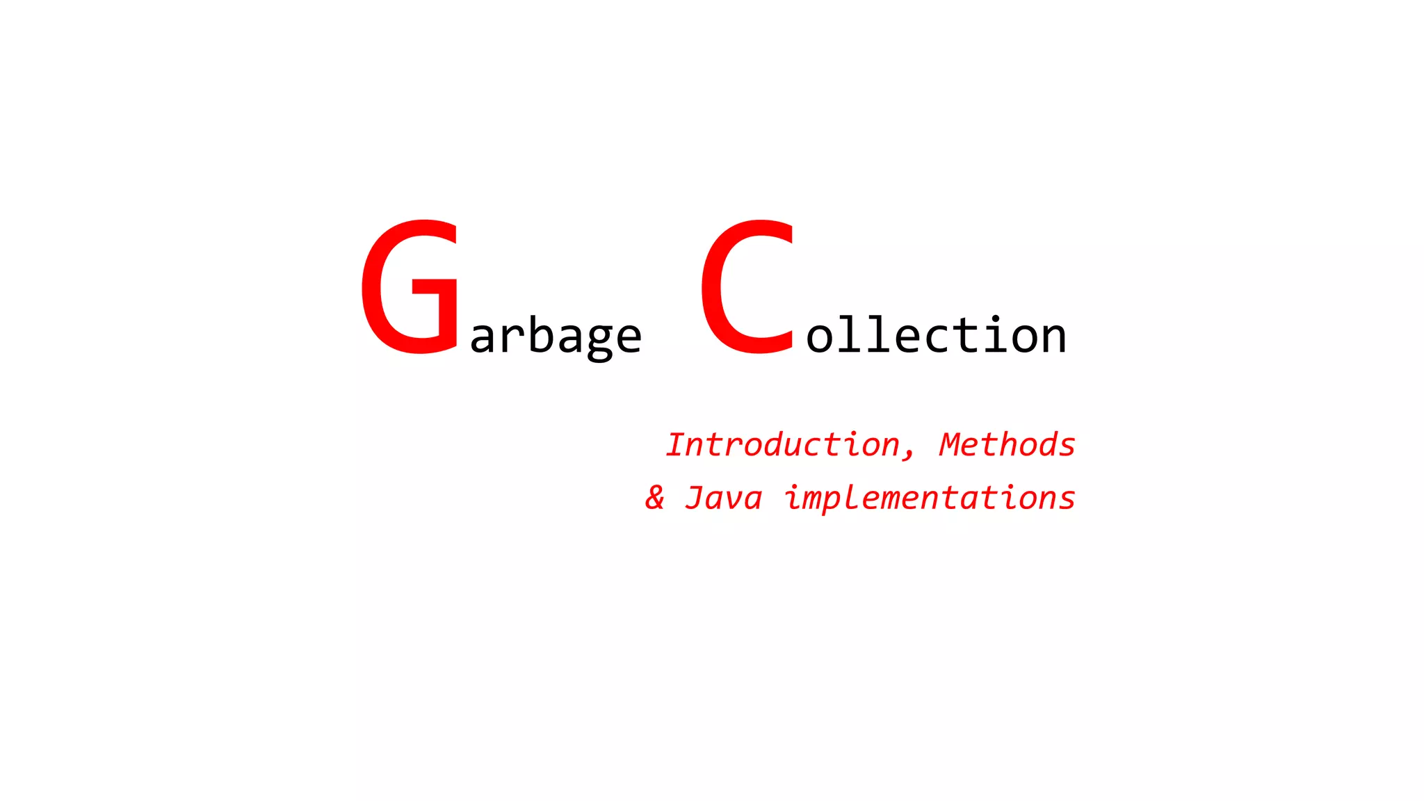 This document provides an overview of garbage collection, including: