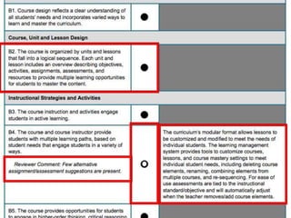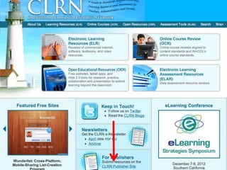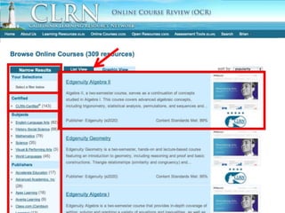 This document summarizes information from the California Learning Resource Network (CLRN) about their process for reviewing online courses. CLRN has over 200 volunteer educators who review courses based on alignment to state standards and quality online course standards. The review is a multi-step process where courses are examined for academic rigor, social content, instructional design, and technology. Reviews help improve courses and inform districts selecting curriculum. CLRN aims to provide vetted, standards-aligned online learning options for California students.