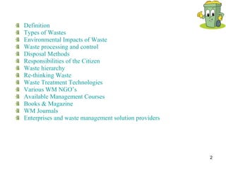 This document provides definitions and an overview of different types of waste including municipal solid waste, industrial solid waste, agricultural waste, hazardous waste, nuclear waste, and electronic waste. It discusses the environmental impacts of waste and various waste management strategies like waste processing, disposal methods, and technologies. It also outlines responsibilities of citizens and provides information on waste management courses, books, journals, and organizations.