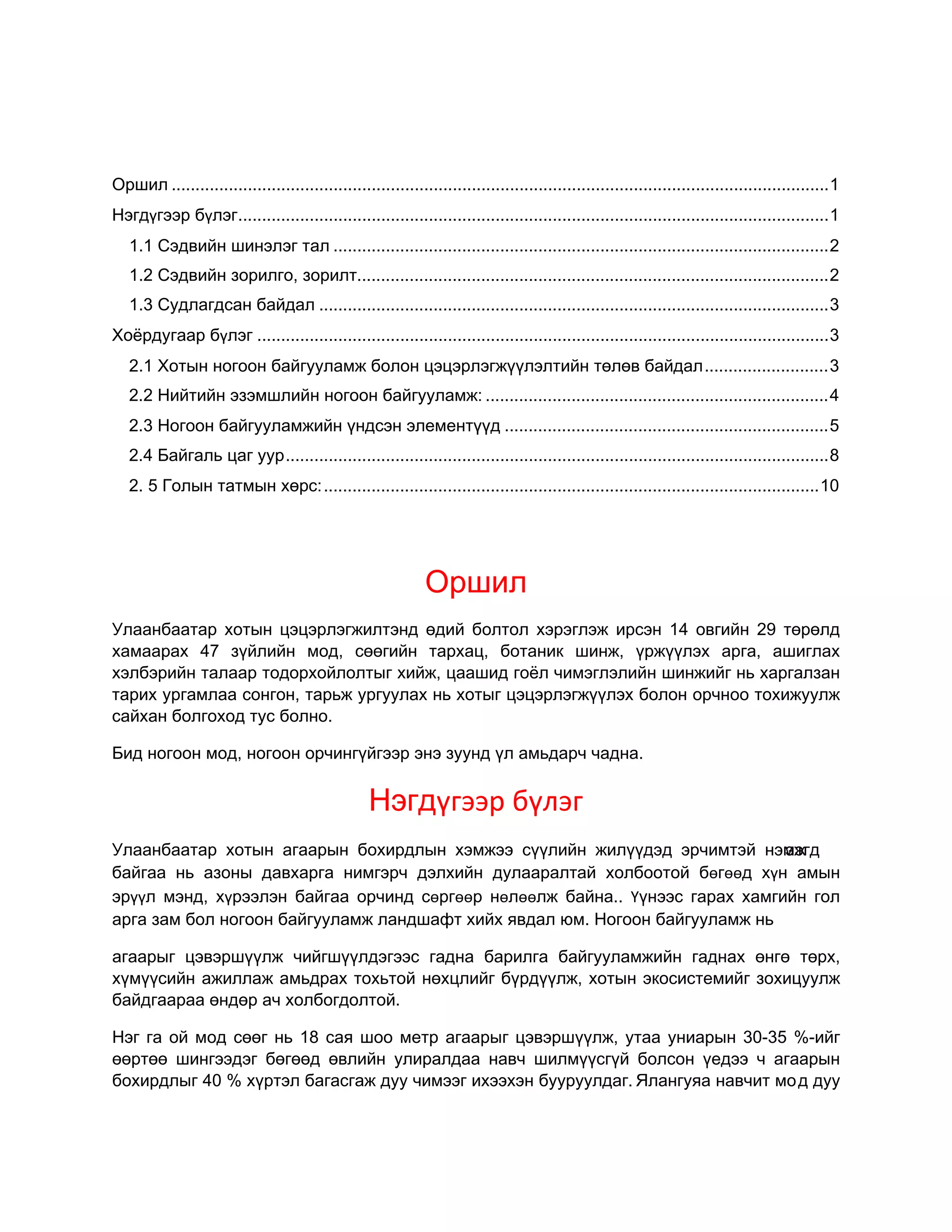 бүëэг ............................................................................................................................ 1 1.1 Ñэдâèéí øèíэëэг òàë ........................................................................................................ 2 1.2 Ñэдâèéí çîðèëгî, çîðèëò................................................................................................... 2 1.3 Ñóдëàгдñàí бàéдàë ........................................................................................................... 3 Хîёðдóгààð бүëэг ........................................................................................................................ 3 2.1 Хîòûí íîгîîí бàéгóóëàìæ бîëîí öэöэðëэгæ¿¿ëэëòèéí òºëºâ бàéдàë .......................... 3 2.2 Нèéòèéí эçэìøëèéí íîгîîí бàéгóóëàìæ: ........................................................................ 4 2.3 Нîгîîí бàéгóóëàìæèéí үíдñэí эëеìеíòүүд .................................................................... 5 2.4 Бàéгàëь öàг óóð .................................................................................................................. 8 2. 5 Гîëûí òàòìûí хөðñ: ........................................................................................................ 10 Îðøèë Óëààíбààòàð хîòûí öэöэðëэгæèëòэíд ºдèé бîëòîë хэðэгëэæ èðñэí 14 îâгèéí 29 òºðºëд хàìààðàх 47 ç¿éëèéí ìîд, ñººгèéí òàðхàö, бîòàíèê øèíæ, ¿ðæ¿¿ëэх àðгà, àøèгëàх хэëбэðèéí òàëààð òîдîðхîéëîëòûг хèéæ, öààøèд гîёë ÷èìэгëэëèéí øèíæèéг íь хàðгàëçàí òàðèх óðгàìëàà ñîíгîí, òàðьæ óðгóóëàх íь хîòûг öэöэðëэгæ¿¿ëэх бîëîí îð÷íîî òîхèæóóëæ ñàéхàí бîëгîхîд òóñ бîëíî. Бèд íîгîîí ìîд, íîгîîí îð÷èíг¿éгээð эíэ çóóíд ¿ë àìьдàð÷ ÷àдíà. Нэгдүгээр бүлэг Óëààíбààòàð хîòûí àгààðûí бîхèðдëûí хэìæээ ñ¿¿ëèéí æèë¿¿дэд эð÷èìòэé íэìэгд эæ бàéгàà íь àçîíû дàâхàðгà íèìгэð÷ дэëхèéí дóëààðàëòàé хîëбîîòîé бөгөөд хүí àìûí эðүүë ìэíд, хүðээëэí бàéгàà îð÷èíд ñөðгөөð íөëөөëæ бàéíà.. Ү¿íээñ гàðàх хàìгèéí гîë àðгà çàì бîë íîгîîí бàéгóóëàìæ ëàíдøàôò хèéх ÿâдàë þì. Нîгîîí бàéгóóëàìæ íь àгààðûг öэâэðø¿¿ëæ ÷èéгø¿¿ëдэгээñ гàдíà бàðèëгà бàéгóóëàìæèéí гàдíàх ºíгº òºðх, х¿ì¿¿ñèéí àæèëëàæ àìьдðàх òîхьòîé íºхöëèéг б¿ðд¿¿ëæ, хîòûí эêîñèñòеìèéг çîхèöóóëæ бàéдгààðàà ºíдºð à÷ хîëбîгдîëòîé. Нэг гà îé ìîд ñººг íь 18 ñàÿ øîî ìеòð àгààðûг öэâэðø¿¿ëæ, óòàà óíèàðûí 30-35 %-èéг ººðòºº øèíгээдэг бºгººд ºâëèéí óëèðàëдàà íàâ÷ øèëì¿¿ñг¿é бîëñîí ¿едээ ÷ àгààðûí бîхèðдëûг 40 % х¿ðòэë бàгàñгàæ дóó ÷èìээг èхээхэí бóóðóóëдàг. Яëàíгóÿà íàâ÷èò ìî д дóó