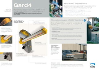 The document describes the Gard series of automatic road barriers for passages up to 3.75 meters/12.3 feet. The barriers come in 230V AC and 24V DC motor versions and have safety and control features like electronic obstacle detection and testing of safety devices. They are suitable for industrial, public, and parking applications.