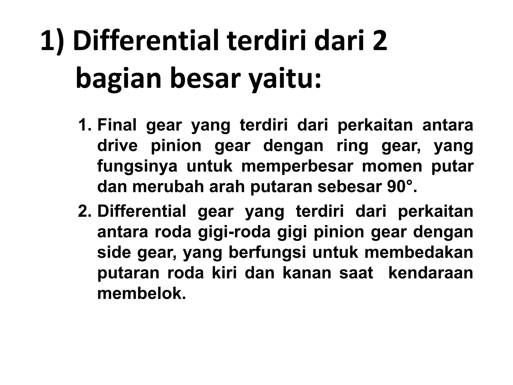Dokumen ini menjelaskan komponen dan fungsi differential dalam kendaraan, termasuk cara kerjanya saat berbelok dan berjalan lurus. Selain itu, dokumen mencakup aspek teknis seperti backlash, pre load, dan run out, serta pentingnya perawatan untuk komponen differential untuk mencegah kerusakan. Penekanan juga diberikan pada pemilihan suku cadang yang orisinil dan pemeriksaan menyeluruh sebelum melakukan perbaikan.