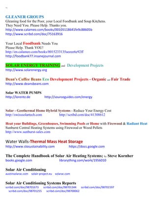 This document provides links to manuals, books, and resources about organic gardening techniques, renewable energy technologies, waste reduction strategies, and aquaponics systems. Some of the techniques discussed include rainwater harvesting, vegetable oil-based vehicles and heating systems, composting, biochar, EM compost teas, seaweed gardening, hydroponics, and aquaponics. The goal is to share information about increasing plant yields through organic and sustainable methods.