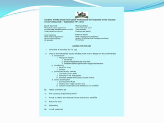 The document summarizes a sailing club meeting held on September 29th, 2011. It lists 10 participants who split into groups to conduct water quality tests and learn sailing skills from Mr. Diamond. The groups then went to a nearby island by boat to explore the trail and search for marine life like stingrays, trying to avoid expensive boats along the way. In the end, the whole team reunited by the sand bar.