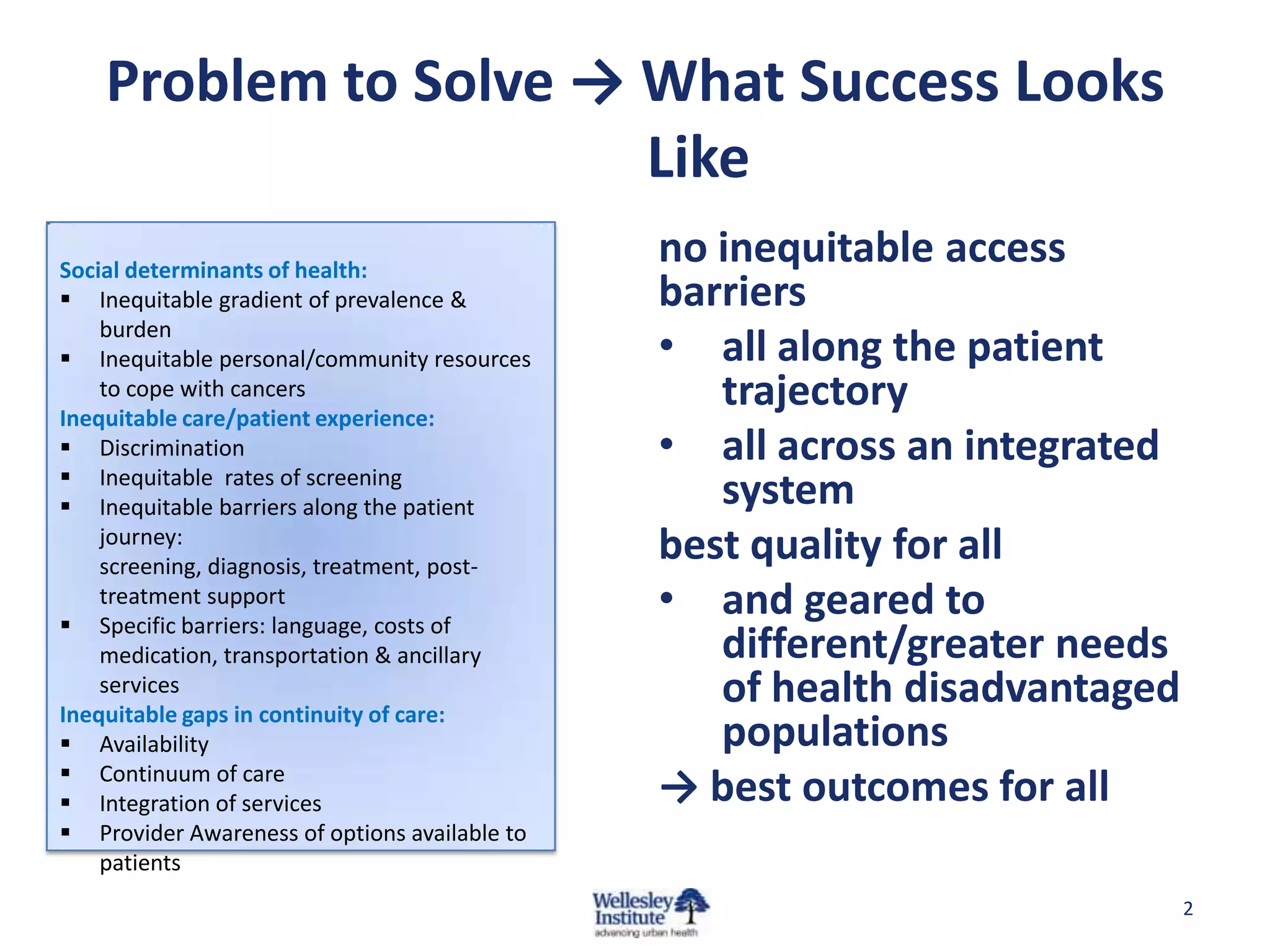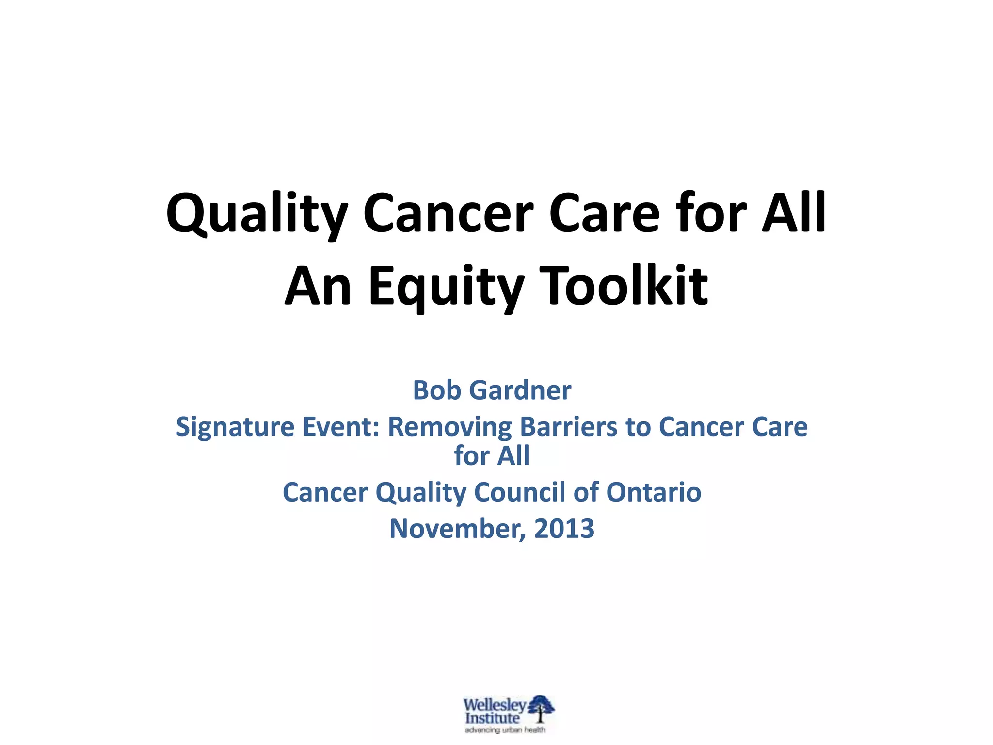 The document outlines an equity toolkit aimed at improving cancer care for disadvantaged populations by addressing social determinants of health and identifying barriers throughout the cancer care journey. It recommends solutions such as equity-focused planning, data collection, and community partnerships to enhance access and quality of care for underserved groups. The toolkit emphasizes the necessity of embedding equity into health care systems, programs, and performance management to ensure comprehensive and culturally competent cancer care.