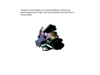 Gardner's theory of multiple intelligences proposes that there are 8 different forms of intelligence: musical, logical-mathematical, spatial, intrapersonal, bodily-kinesthetic, linguistic, interpersonal, and naturalist. Each form of intelligence is relatively independent and involves different skills. Examples are given of how each type of intelligence may be demonstrated.