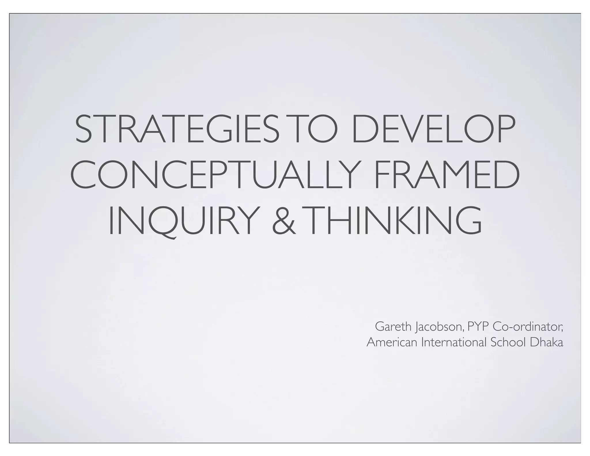 The document discusses strategies for developing inquiry-based learning in the classroom, highlighting various types of inquiry including structured, guided, and open inquiry. It emphasizes the importance of framing inquiry around big ideas, enduring understandings, and essential questions to promote student curiosity and deeper understanding. Additionally, it suggests that planning for inquiry should connect prior knowledge with new concepts to foster reflective thinking and personal connections.