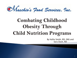 This document discusses efforts by Maschio's Food Services and registered dietitians Hallie Smith and Sara Dash to combat childhood obesity through nutritious school meals in the Garfield School District. It outlines the nutritional standards that Maschio's meets for the National School Lunch Program, such as limiting fat and providing one-third of daily recommended nutrients. It also describes initiatives like highlighting fresh fruits and vegetables, increasing whole grains, and partnering with local farms for a farm-to-school program. The goal is to serve balanced and healthy meals to students to support their growth and development.
