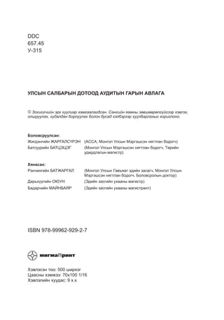 САЛБАРЫН ДОТООД АУДИТЫН ГАРЫН АВЛАГА ТАЙЛАНГИЙН НЭГТГЭЛ [Тайлангийн нэгтгэл хэсэгт аудитын ажлын зорилго ба цар хүрээ, гол илэрсэн асуудлууд, нэгдсэн дүгнэлт болон зөвлөмжийг товч дүгнэсэн байдлаар харуулдаг. Энэ хэсэг нь аудитын багийн тодорхойлсон гол асуудлуудыг тайлан хэрэглэгч тоймлон олж мэдэх боломжийг олгодог. Тайлангийн нэгтгэл хэсэгт багтсан аудитаар илэрсэн асуудлууд нь уг асуудлуудыг дэлгэрэнгүй байдлаар тусгасан тайлангийн хэсэг р¿¿ холбогдсон байх нь зүйтэй. Аудитаар илэрсэн асуудлууд дээр үндэслэн аудитын багийн өгсөн дүгнэлтээс нэгдсэн дүгнэлтийг гаргасан байна. Энэ хэсэгт аудитаар ямар дүгнэлт өгснийг мөн дурдана.] 1. ТАНИЛЦУУЛГА [Танилцуулгын хэсэгт аудит хийгдсэн байгууллага ба объектын талаар товч мэдээллийг оруулна. ] 2. АУДИТЫН ЗОРИЛГО БА ЦАР ХҮРЭЭ 2.1 Аудитын зорилго [Энэ хэсэгт аудитын зорилгыг дэлгэрэнгүй байдлаар бичих ба ямар шалтгаанаар аудит хийх болсон, ямар зорилгыг хангахын тулд аудит хийгдсэн талаар тайлан хэрэглэгч сайтар ойлголт олж авах боломжтой байхаар бичигдэнэ.] 2.2 Аудитын цар хүрээ [Энэ хэсэгт аудитын ажлын цар хүрээг дэлгэрэнгүй байдлаар тодорхойлох ба аудитад хамрагдахгүй хэсэг байсан бол тэдгээрийг тусгайлан дурдана. ] 3. АУДИТЫН ҮР ДҮН 3.1. Илэрсэн асуудлууд [Аудитаар илэрсэн асуудал гэдэг нь бодит нөхцөл байдлыг тодорхойлно гэсэн үг юм. Аудитын багийн нэгдсэн дүгнэлт ба зөвлөмжид хамааралтай, тэдгээрийг дэмжих асуудлуудыг энэ хэсэгт харуулна. Ач холбогдол багатай асуудлууд, тэдгээрт холбоотой зөвлөмжийг удирдлагад хүргүүлэх захидалд тусгана. Аудитаар илэрсэн асуудлууд, тэдгээрийн зөвлөмжийг харуулахдаа бодитоор ямар нөхцөл байдал, алдаа зөрчил, асуудал оршин байгаа болох, тэдгээр нь ямар байх ёстой байсан гэдгийг харьцуулах байдлаар тайлагнана.] 133