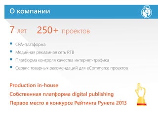 Компания Garin Studio является цифровым и социальным медиа агентством с более чем 7-летним опытом и более 250 проектами. Основные направления включают разработку веб-сайтов, мобильных приложений, интернет-маркетинг и социальные медиа, а также репутационный менеджмент. Они предлагают собственные технологии и платформы для повышения эффективности рекламы и продвижения клиентов в интернете.