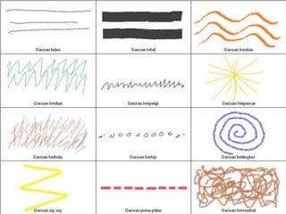 Dokumen ini membincangkan pelbagai jenis garisan dalam seni, termasuk garisan tebal, halus, beralun dan berpancar, serta kesan dan teknik yang dapat digunakan untuk menghasilkan garisan. Ia juga menerangkan hubungan antara garisan dan pergerakan dalam alam dan ciptaan seni, serta cara garisan digunakan untuk mencipta corak, ton, bentuk, dan ilusi ruang. Ringkasnya, dokumen memberikan pandangan menyeluruh tentang pentingnya garisan dalam seni dan alam sekeliling.