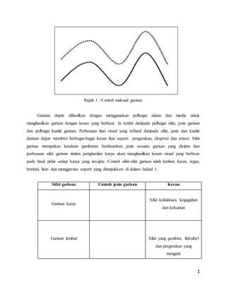 Dokumen ini menerangkan definisi seni sebagai ekspresi manusia yang melibatkan penghasilan karya seni visual melalui teknik dan media tertentu. Ia membincangkan kepentingan unsur garisan dalam mencipta kesan visual yang berbeza, termasuk sifat dan teknik penghasilan garisan. Selain itu, dokumen ini juga membincangkan aplikasi garisan dalam lukisan serta jenis-jenis grafik dan fungsinya dalam masyarakat, termasuk logo, poster dan pembungkusan.