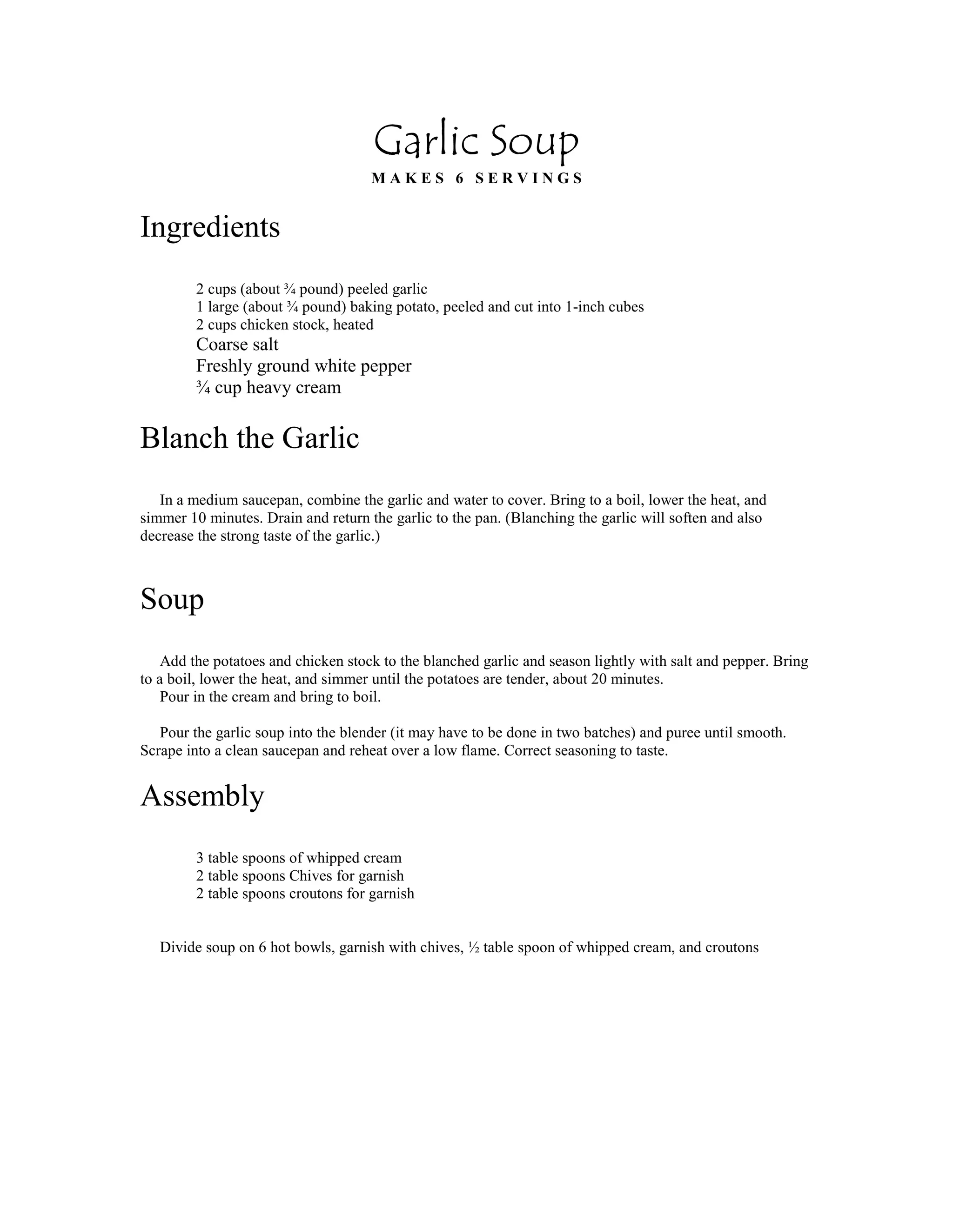 This recipe makes garlic soup for 6 servings. It involves blanching 2 cups of garlic and simmering it with 1 large potato cut into cubes and 2 cups of chicken stock until the potatoes are tender. Then heavy cream is added and blended until smooth. The soup is garnished with whipped cream, chives, and croutons before serving.