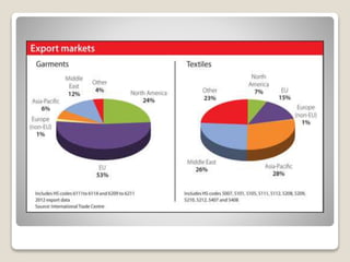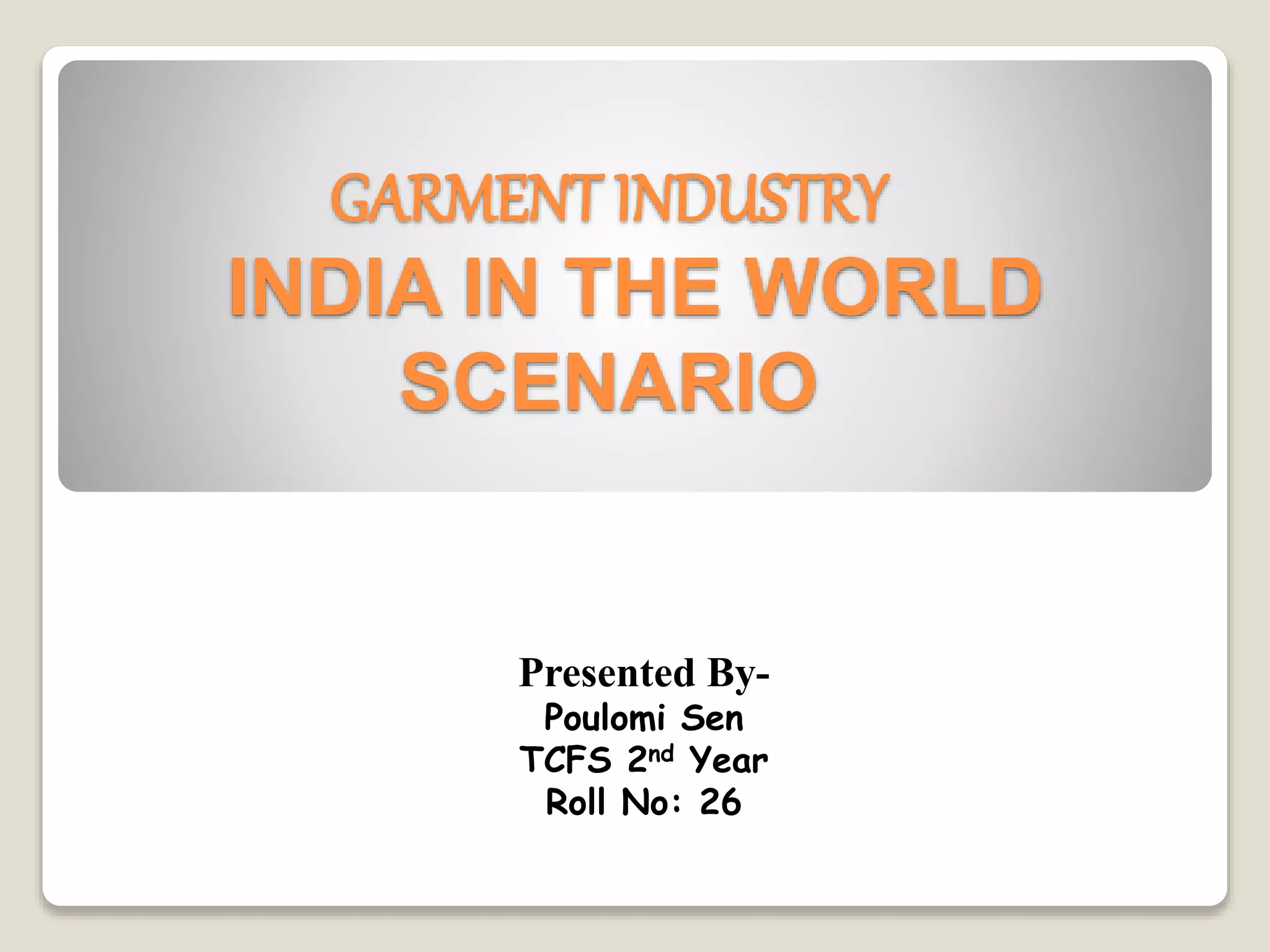 The Indian garment industry is an important sector that employs millions of people and accounts for a significant portion of India's GDP and exports. It has grown substantially over the years at 30% annually and is now one of the largest exporters of garments globally, though it faces competition from countries like Bangladesh and China. The industry relies on India's advantages like availability of raw materials and cheap labor but also faces challenges around technology, skills, and government policies.
