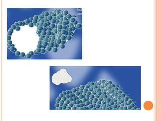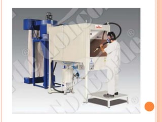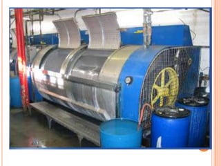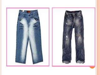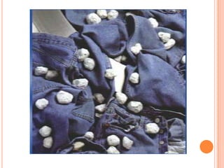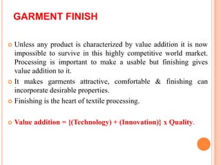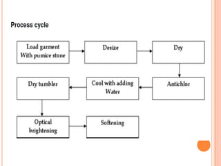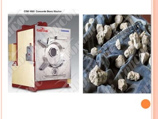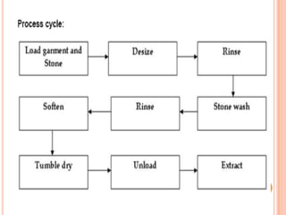 The document discusses different methods of finishing garments, including stone washing. Stone washing involves tumbling freshly dyed jeans with pumice stones to produce a pre-washed and faded look through abrasion. The degree of fading depends on factors like the garment to stone ratio, washing time, stone size and hardness. Stone washing can damage machinery and pollute water. It also risks uneven fading and back staining if dye is redeposited on fabrics.