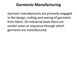 1. Design and pattern development where sketches are turned into patterns for specific sizes.