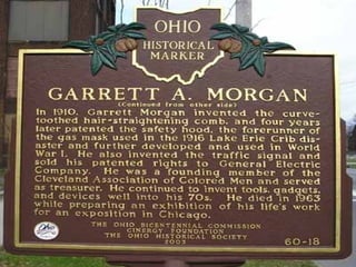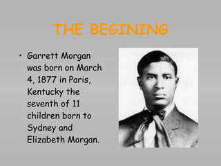 Garrett Morgan was an African American inventor and businessman born in 1877 in Kentucky. He moved north for better educational opportunities and settled in Cleveland, Ohio. Morgan invented many impactful products including a hair care product and an early traffic signal. He founded a newspaper and advocated for civil rights. Morgan made important contributions but faced challenges from racism and lost most of his vision later in life. He died in 1963 after a life dedicated to invention and social progress.