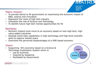 The document discusses the opportunity for Northern Ireland to become a leader in intelligent energy systems through increased use of renewable energy, energy storage, and demand side management. It outlines Matrix's mission to advise the Northern Ireland government on high tech opportunities. The vision is for Northern Ireland's economy to be led by business and academia in science and technology exploitation. The document recommends that Northern Ireland establish an Intelligent Energy System Group and delivery team to drive projects integrating distributed generation, storage, and controls to optimize renewable energy use while reducing grid upgrades. It argues Northern Ireland is well positioned due to its resources, infrastructure, academic strengths, and industrial capabilities.
