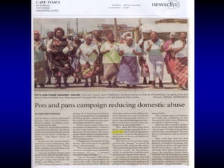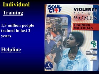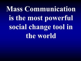 This document discusses using mass media like television and radio dramas to educate the public and promote social change. It describes the Soul City model which creates edutainment programs in South Africa and other countries. The dramas cover social issues and are designed based on audience research. They aim to reach large audiences to raise awareness and influence attitudes. Additional outreach includes booklets, trainings, helplines, advocacy, and youth programs to further engage communities on the issues. Evaluation finds the Soul City programs reach over 30 million people across 10 countries.
