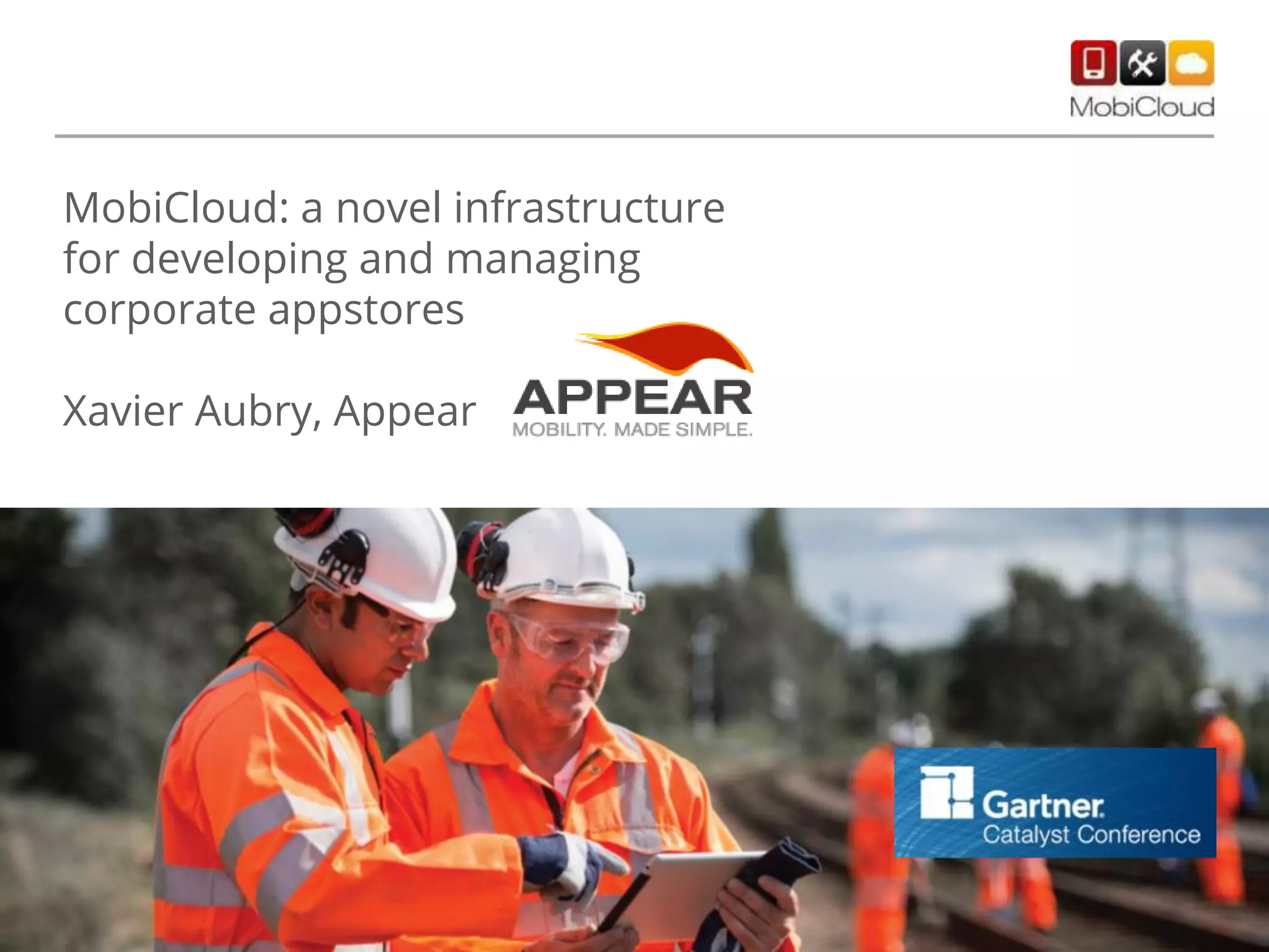 The document discusses mobicloud, a novel infrastructure for corporate appstores that addresses key challenges like integration with legacy systems, user involvement, and flexible deployment. It highlights the benefits of managing mobile applications throughout their lifecycle, employing a platform approach, and utilizing ready-made apps for customization. Furthermore, it emphasizes mobility transformation through user cases and the importance of delivering an ergonomic app experience.