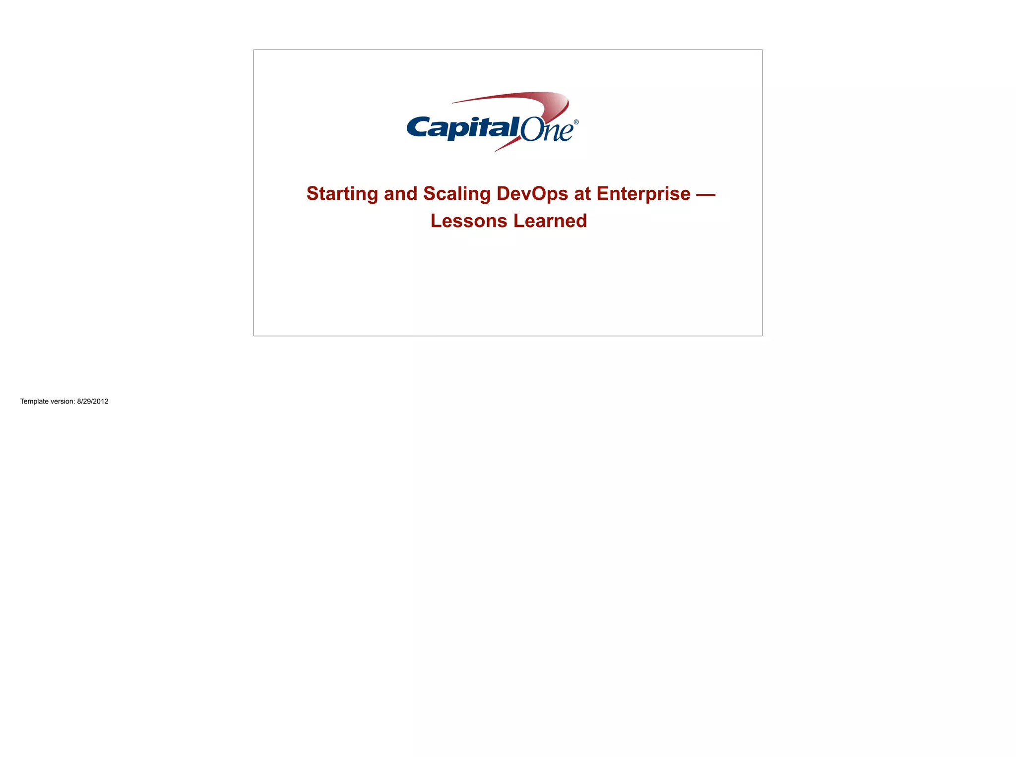 The document discusses Capital One's transition from traditional software development practices to DevOps over the past 5 years. It describes how Capital One originally used mostly outsourced development, waterfall methodology, quarterly releases, and manual processes. A proof of concept project using agile tools like Hudson, Maven, and Nexus showed improvements from days to minutes for releases. This success was shared with other teams, and the executive leaders approved a DevOps strategy to move operations and security closer to development.