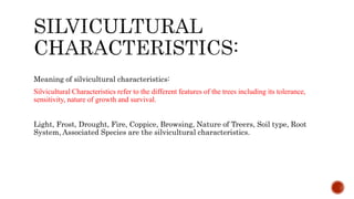 This document summarizes the silvicultural characteristics of the Dabdabe tree (Garuga pinnata). It describes that Dabdabe is a deciduous tree found at elevations up to 1300m that is associated with Sal and Teak trees. It grows best in slightly acidic soil and is able to tolerate some grass and weeds. The document then lists the tree's characteristics including being a strong light demander, frost tender, drought sensitive, able to resist fire, and able to coppice and produce root suckers. It concludes by detailing the various economic and traditional medicinal uses of Dabdabe tree.